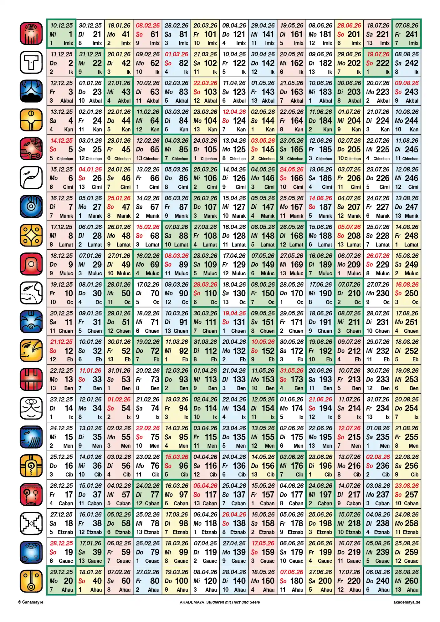 Mit KIN-Zahlen in Wellenformation und leicht ablesbaren Portal- und Zentrumstagen sowie Umrechnungsschlüssel für die traditionelle Zählung …